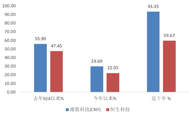 历史收益碾压:数据说明一切——今年以来港股科技指数涨幅29.69%,碾压恒生科技的22.05%;近十年累计收益93.35%,跑赢恒科近34个百分点。